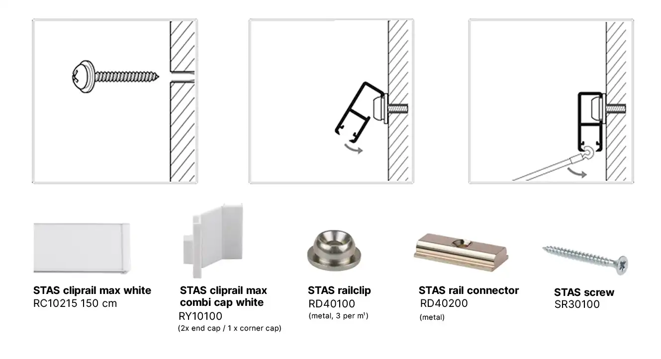 The STAS cliprail max butts up to your ceiling to create a neat joint. The rail, which is available in white or a natural aluminium colour, is easy to fit using the STAS cliprail clip and is most attractive when used with flat ceilings.